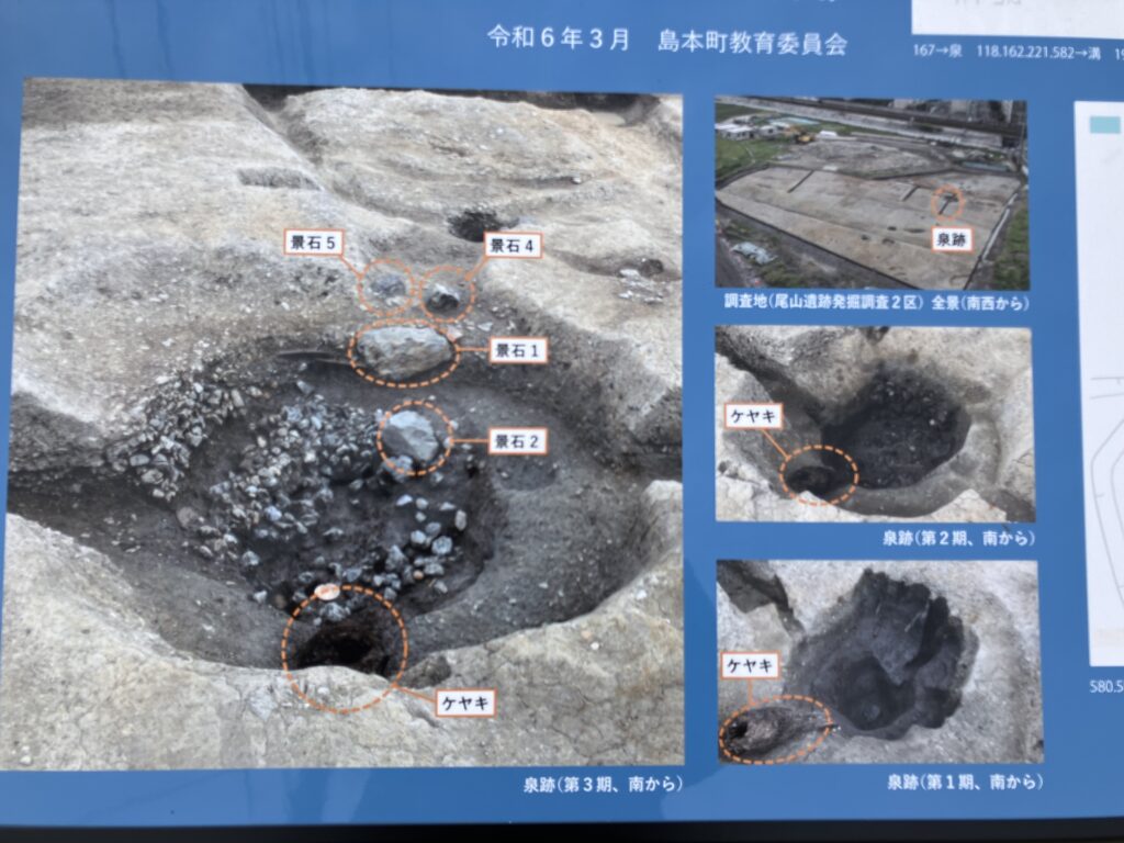 再現された尾山遺跡の池泉遺構に設置された案内板